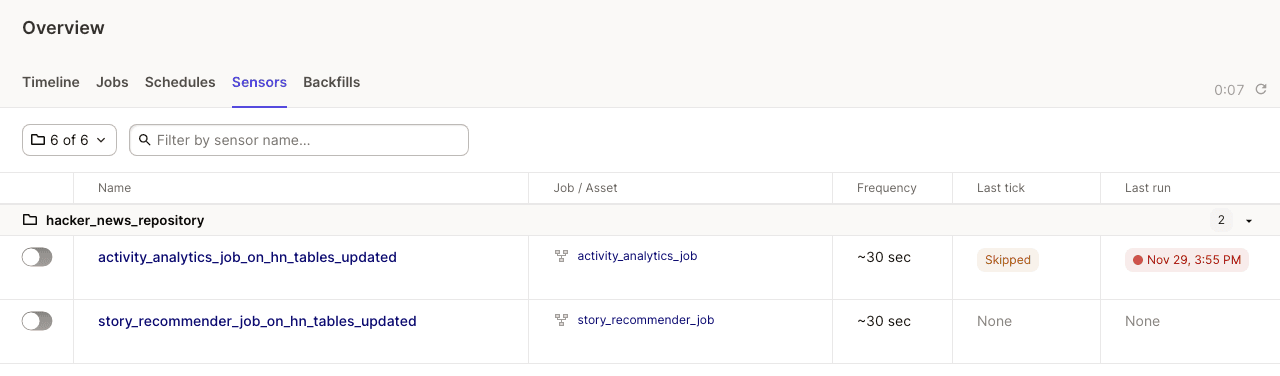 For more examples of sensors, check out the following in our Hacker News example:
