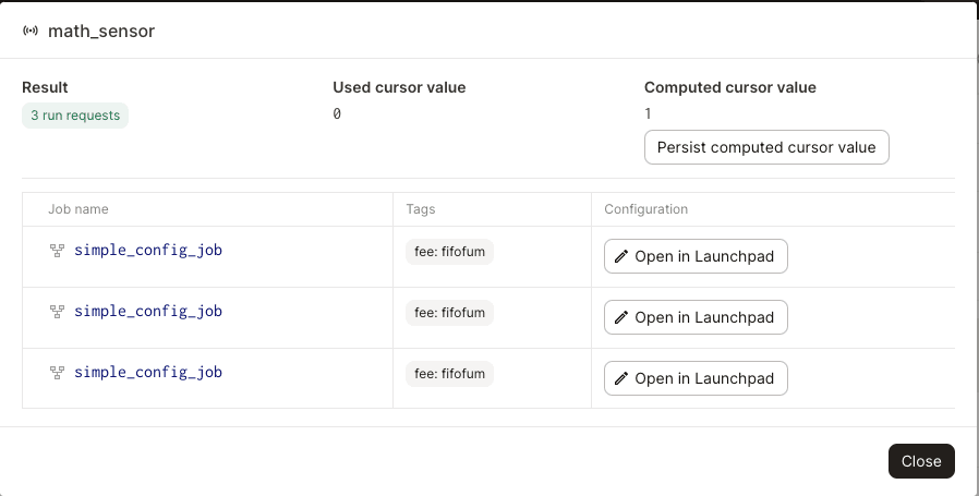 For debugging purposes, it's often useful to describe why a sensor might not yield any runs for a given evaluation. The sensor evaluation function can yield a SkipReason with a string description that will be displayed in the UI.